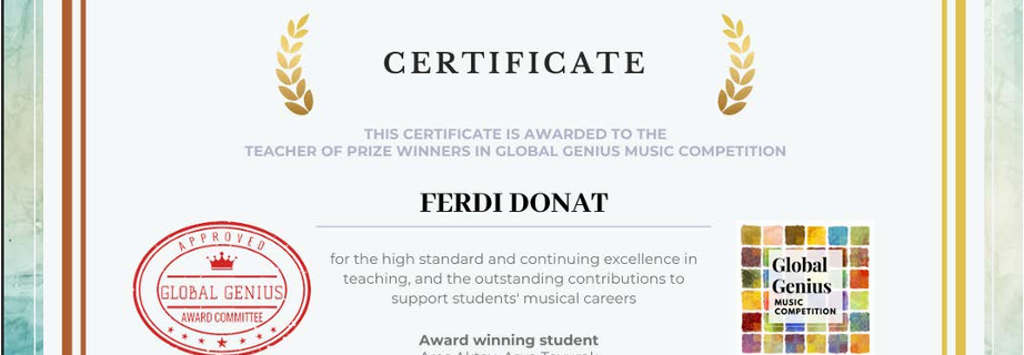 Bu sertifika, Global Genius Music Competition (Küresel Deha Müzik Yarışması) tarafından,yetiştirdiğim öğrencilerin uluslararası düzeyde gösterdiği üstün performans ve elde ettikleridereceler neticesinde şahsıma layık görülmüştür.